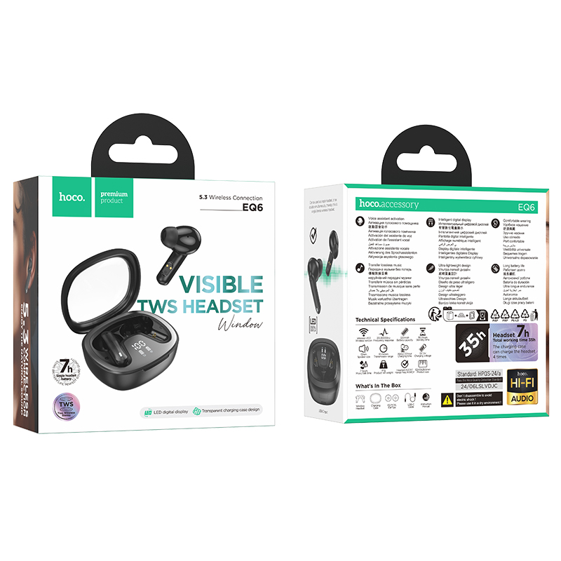 With a compact and ergonomic fit, the Hoco EQ6 Shadow earbuds provide a comfortable and secure wearing experience, perfect for long hours of use.