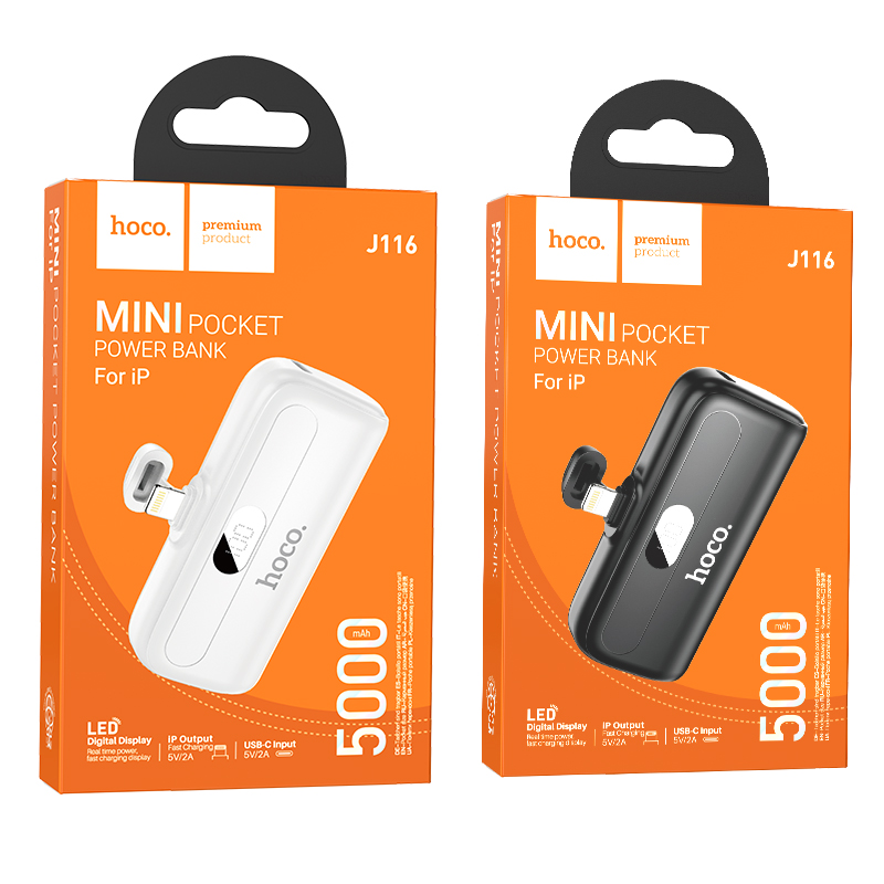 The Hoco J116 Cool Fast Charging Pocket Mini Power Bank is a 5000mAh power bank that is compatible with iPhones and has a Type-C input. It is a portable power bank that can be charged directly using a Type-C interface cable.
