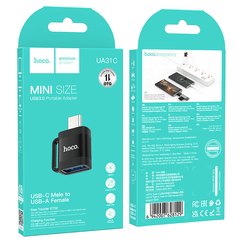 The Hoco UA31C serves as an adapter for Type-C male to USB-A female, ensuring broad compatibility with various devices, including smartphones, laptops, and tablets.